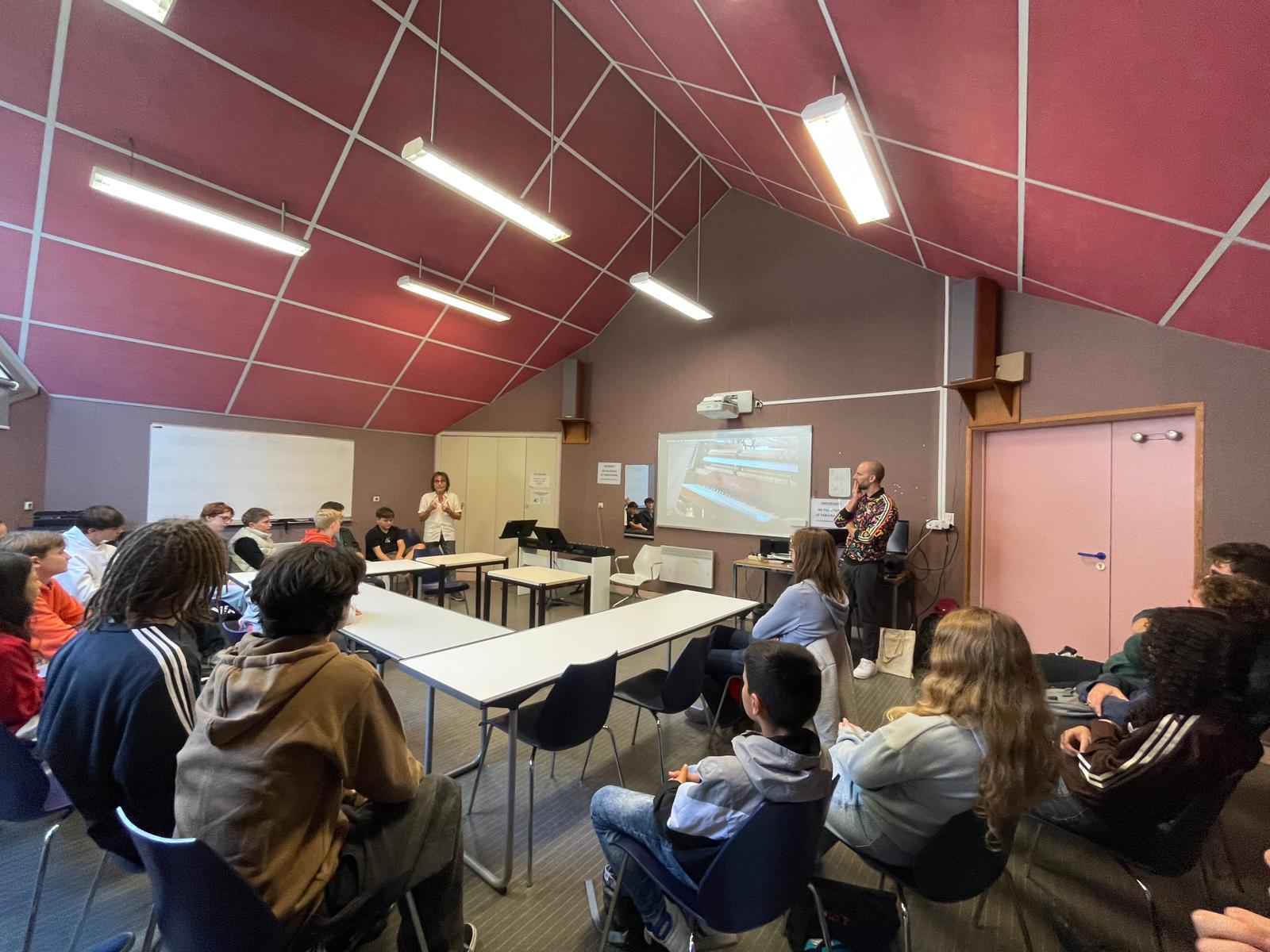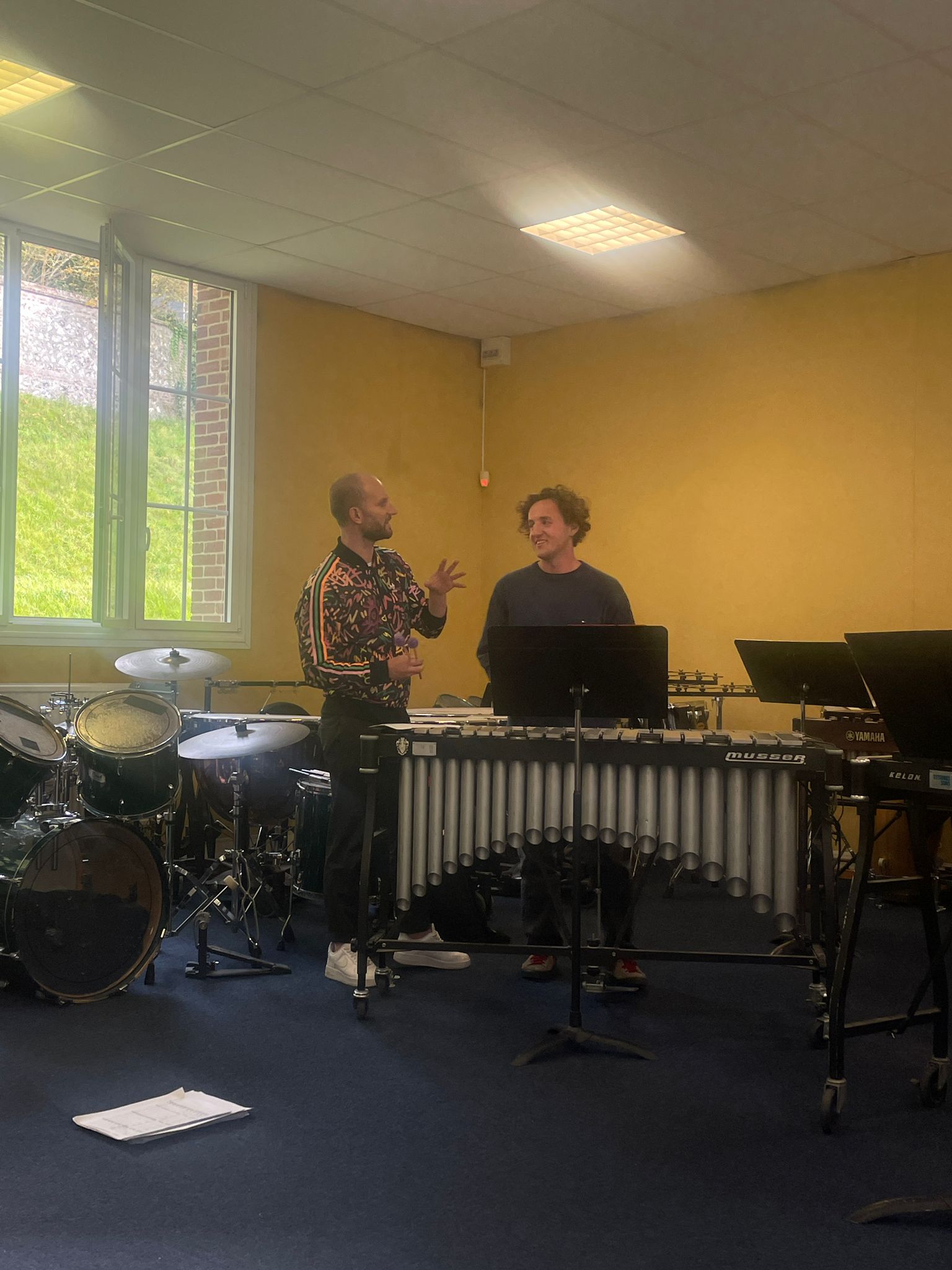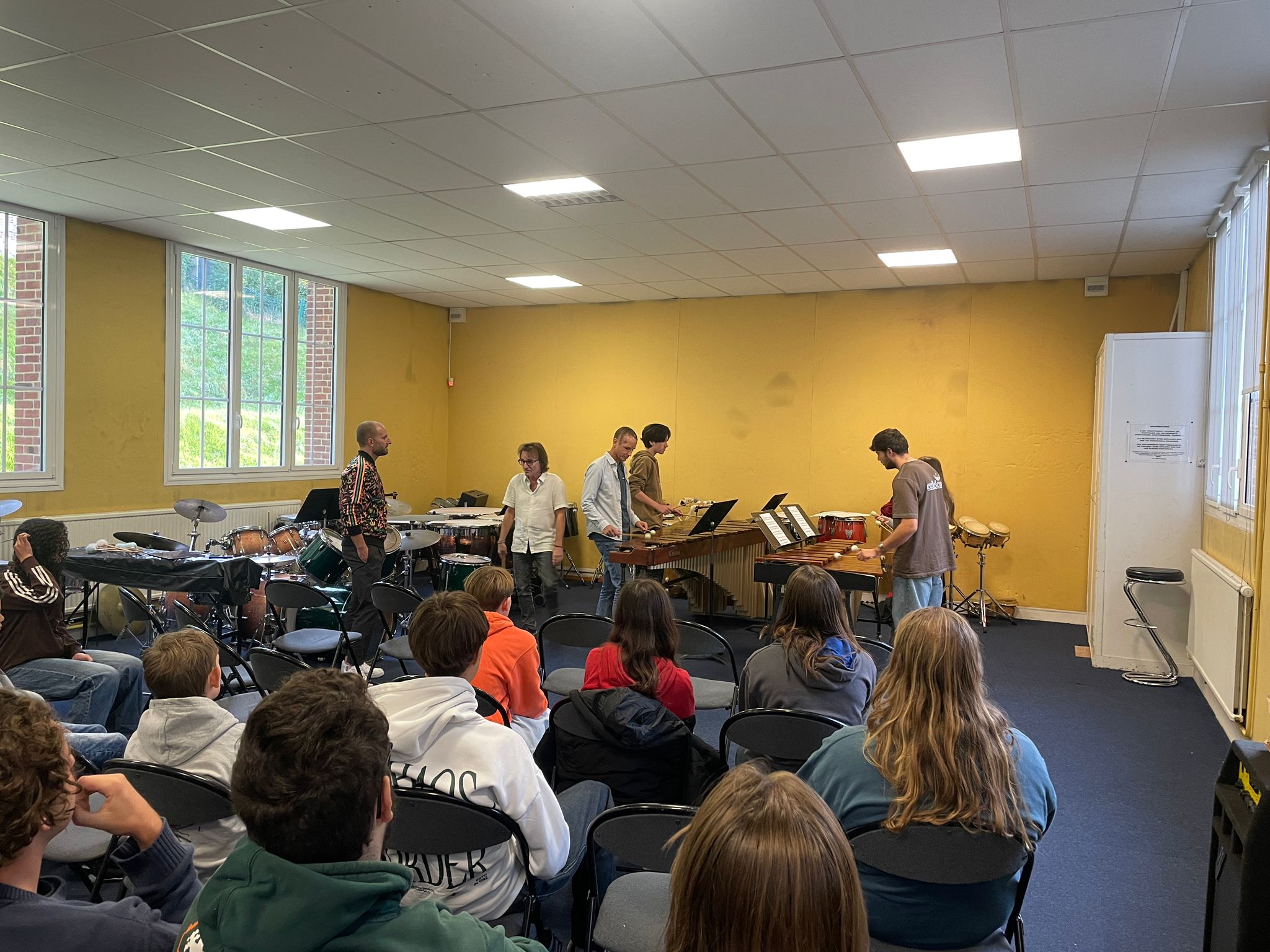 En octobre 2025, les élèves du Conservatoire de la Côte d’Albâtre ont pu s’exercer aux percussions et notamment au marimba avec Paul Changarnier, ancien élève du conservatoire et membre du Trio SR9.